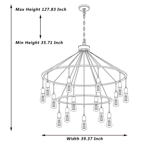 With this pairing of an understated double wagon wheel design and plenty of light, this unique chandelier is just the thing for brightening up your home with a versatile touch of classic style. A wide conical silhouette includes a pair of concentric bands with the appearance of 15 60W standard bulbs (sold separately) being around them. Borrowing a hint of the past with a cast-iron-like textured black finish and exposed, dangling lamps, this dining room chandelier is sure to be a style centerpiece. Plus, it is height-adjustable and sloped-ceiling compatible. A two-year warranty is included.